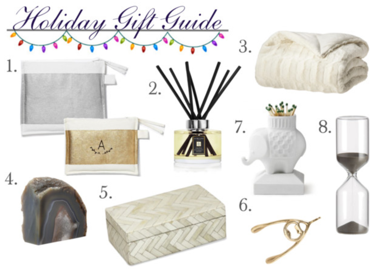 1. West Elm Pouches ($9 and $12) // 2. Jo Malone Diffuser ($80) // 3. Faux Fur Throw ($25) // 4. Threshold Agate Bookend ($20) // 5. Williams Sonoma Zig-Zag Box ($99) // 6. Wishbone Bottle Opener ($12) // 7. Jonathan Adler Elephant Matchstrike ($42) // 8. 15-minute Hourglass ($10)