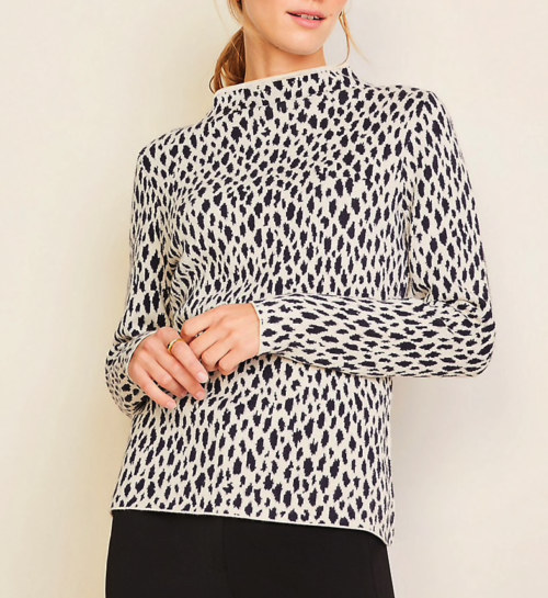 This Funnel Neck Cheetah Sweater from Ann Taylor is lovely. I adore the easy, two-tone print. And the funnel neck is a nice turtleneck alternative. I would look nice with black separates, or with a colored trouser.
