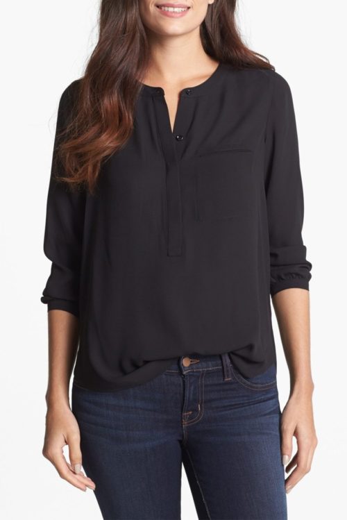 This NYDJ Henley 3/4 Sleeve Blouse has a look that can be casual or professional depending on how you style it.  The blouse comes in 23 colors and prints.  It also comes in petite sizes and plus-sizes.