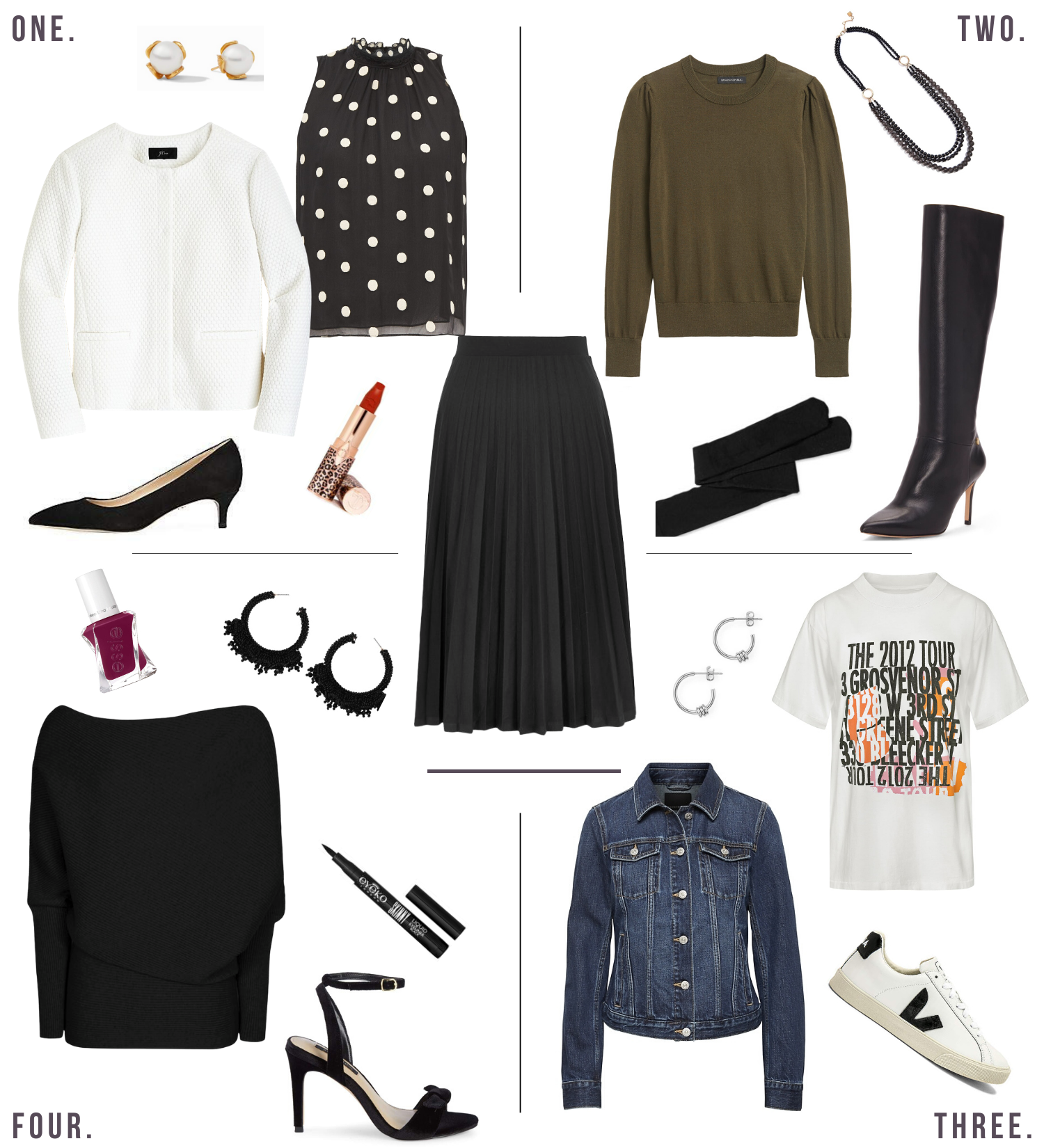 A black pleated skirt is an easy classic. It dresses up, it dresses down. The trick is to have it hemmed to the perfect length for you, which will probably be just under- or just over-the-knee. Here’s how to style it.