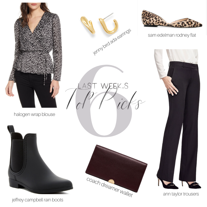 Halogen Wrap Blouse // I’m a sucker for a waist-defining work top, and this Halogen blouse hits all the right notes.  To give it a bit more structure, switch out the tie belt for a skinny, black leather belt.  Plus-size?  This Who What Wear blouse in leopard print has a similar look.