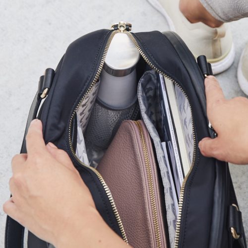 This large Allyn Tote is on point.  Laptop storage, separated compartments for smaller tech items, keys, water bottle, etc..   The drop on the shoulder straps is long enough to sling it over your shoulder.  And even though the bag is a large size, it doesn’t feel bulky.