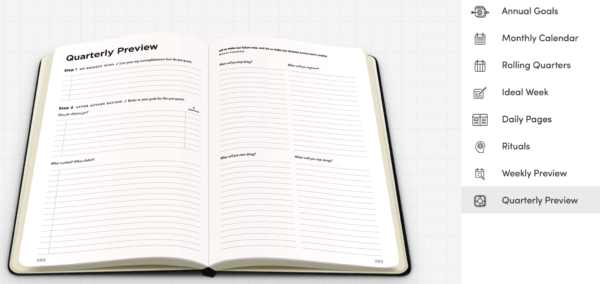 Full Focus is a quarterly planner that is supposed to clear your goals, help you feel less overwhelmed, and help you progress.  It feels and looks like a Moleskin notebook.  And it runs $40 per quarter or $125 per year for the basic planner.