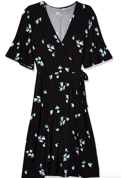 This Amazon Essentials Kimono-Sleeve Wrap is a comfortable and stylish.  The fuller sleeve makes the dress a little more fun.  And the aqua and black print is pretty without being too frilly.  Sizes run XS to XXL.