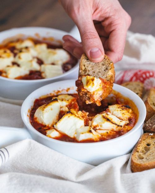 If it’s hot where you are, and you cannot imagine eating a warm vat of tomato sauce, I got you. This baked cheese from The Cookie Rookie uses whole cherry tomatoes instead. Use a few more tomatoes, cook as instructed, and then let cool before spooning over a spinach salad with a simple olive oil dressing.