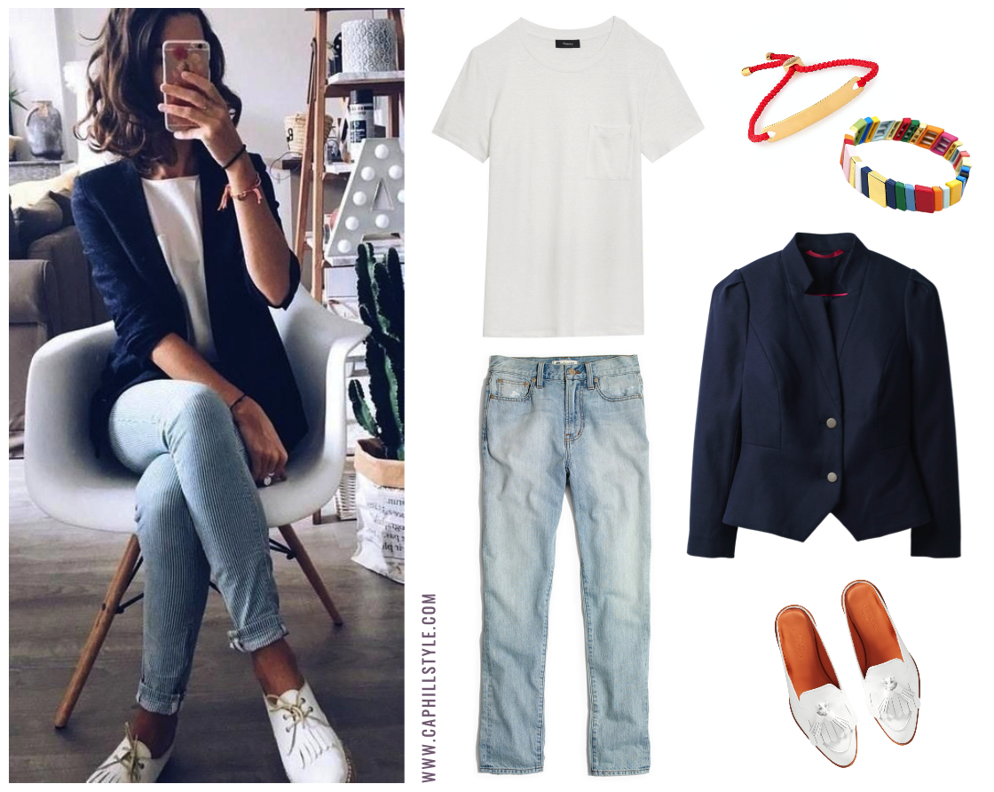 The inspiration photo is actually a light-colored pinstripe pant. J.Crew has a pinstripe jean in misses’ size. Old Navy has one in plus-size. If you’re looking for something really different and fresh, this might be a good option for you.