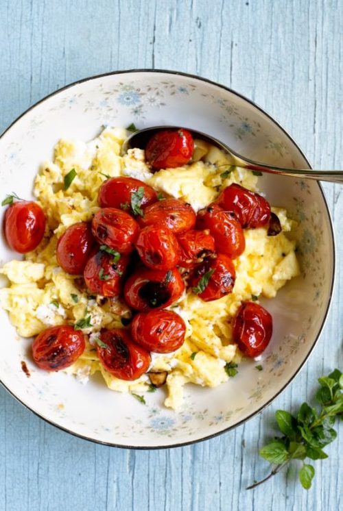 These blistered tomatoes with goat cheese scrambled eggs are so good.  Add a coarse grain toast and you have the perfect meal.  If you want more greens, just toss in some spinach.