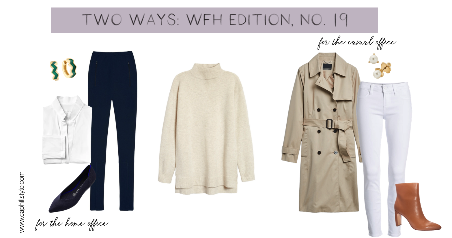 Left // This is a nicer work from home outfit than I usually wear, but I wanted something that would work for a client Zoom call. Layering the collared shirt, with the collar popped, underneath the sweater gives you a really interesting neckline that looks great on a Zoom call. The collared shirt just gives you a great business-attire look.
