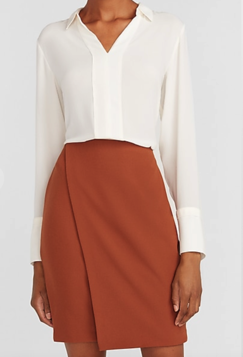 I am showing this Express wrap-front skirt in burnt sienna because I love it, but it also comes in two neutral colors. For a <$50 skirt, its a great piece that is a little different from the standard pencil.