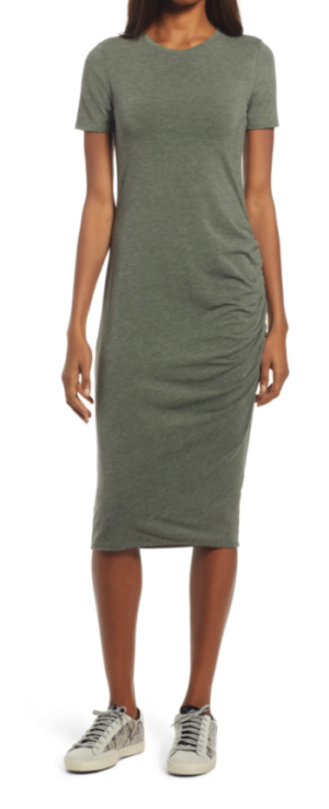 This side-ruched Treasure & Bond dress is so comfortable and easy, you’ll want to wear it all the time.  The side-ruching also gives this dress a nice structure and shape, so it’s also flattering.  The material is also a nice weight, so it’s not thin and see through.