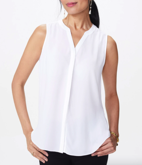 This Sleeveless Pintuck Blouse comes in white and black, and seasonally in other colors. Their Sleeveless Ruffleneck Blouse is also a great choice (also in plus-size).