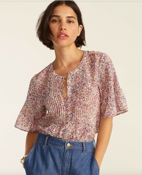 I absolutely adore this top. The Cotton Voile Pintuck Blouse comes in a floral that’s a lovely mix of taupe, mauve and rosy hues. The loop buttons on the front would look great under a light neutral blazer, maybe a cream or olive blazer. This same floral material is available in a peasant-style blouse.