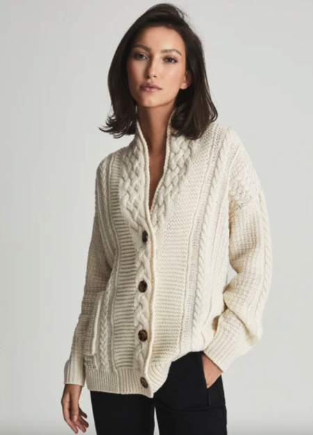 This Reiss Summer Cream Shawl Collar sweater is a showstopper. The variations in the weave pattern make it more interesting that most cardigans. The stand-up collar gives it a sleek look. It’s like the best version of the professor sweater.
