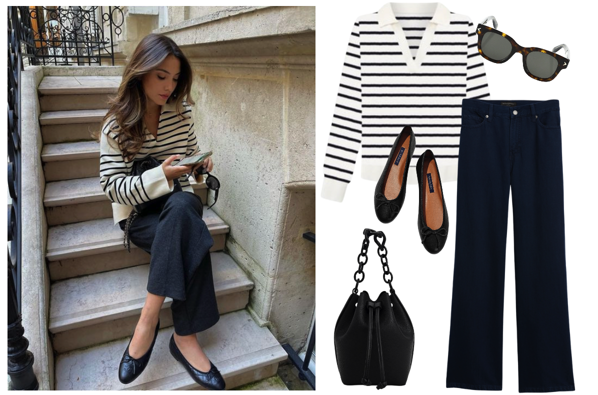 I spotted this image from Wendy Swan on Pinterest. It felt very chic, by comfortable and relaxed. I wasn’t able to find a polo in black stripe, so I switched it up to navy. Let’s remake this outfit for the casual office, shall we?