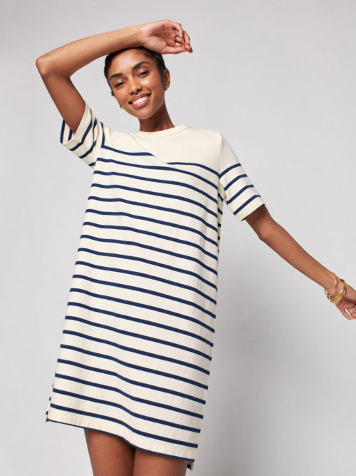 This striped t-shirt dress has a relaxed shape that makes it a great choice for weekends. Just add a chic sandal and a pair of cool hoop earrings, and you’re ready.