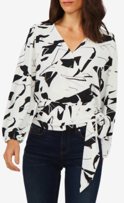 The graphic print on this wrap blouse is chic on its own or under a blazer.
