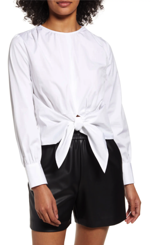 I love this Halogen tie front top. I also love that it costs under-$50. And did I mention that it also comes in petite and plus-size? As for how to style this, I have some thoughts.