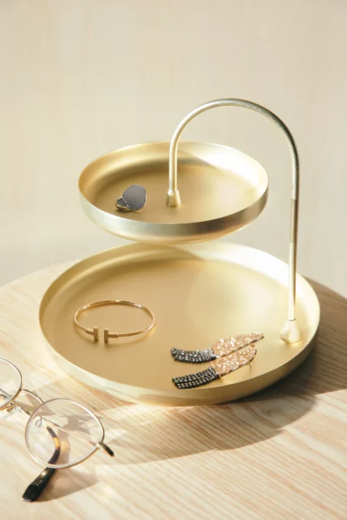 This Umbra tray is perfect for the bedside because the bottom tray can hold larger items, like glasses, and the upper tray can hold smaller items, like jewelry. Looking for something bright and fun? Try this bird tray from Lauren Macintosh.