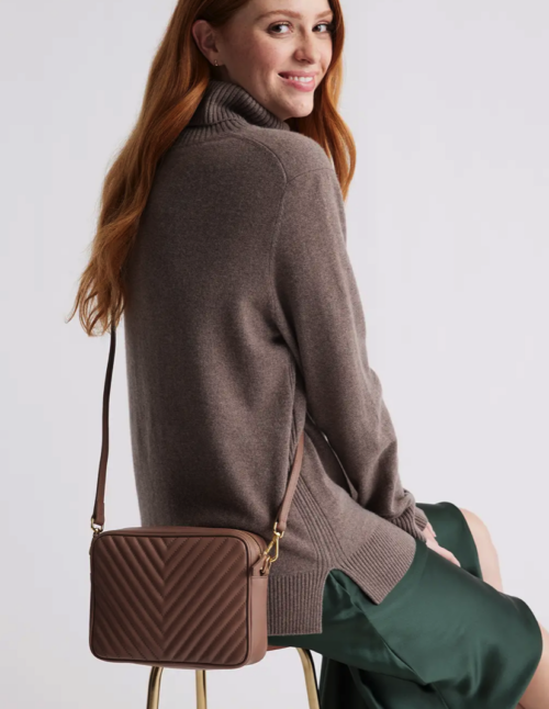 With chevron-quilting and a roomy interior, this mid-price crossbody bag from Quince is a fabulous piece.  The Quince brand creates affordable pieces that are sometimes shockingly well made.  It’s not often you see a full leather bag for under-$150.  And the selection of colors is everything you need for a better-than-basic bag.