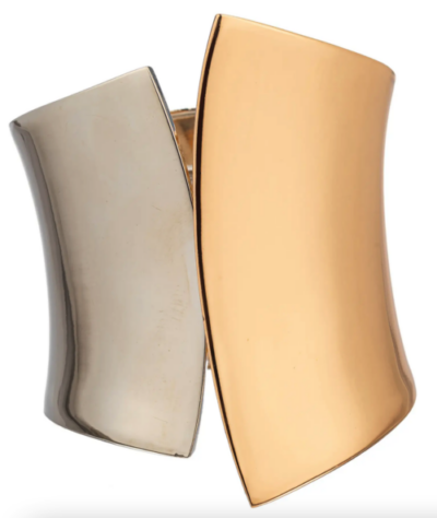 A big cuff bracelet is always a good idea, the two-tone metals help blend other pieces together.