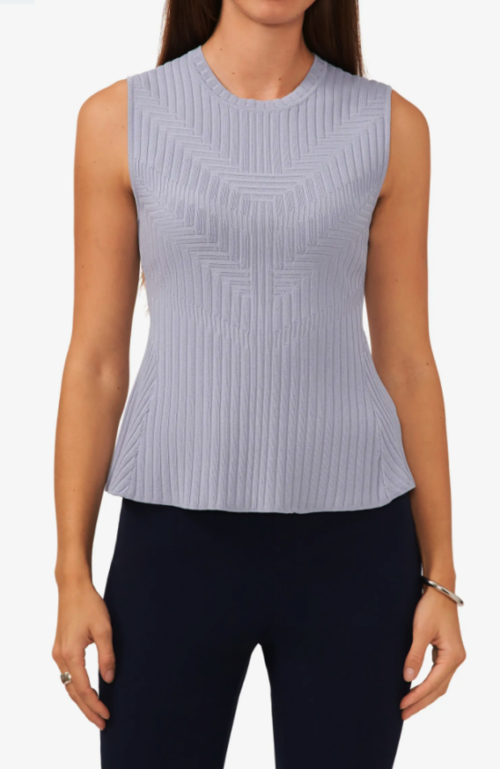 This sleeveless peplum sweater comes in four colors, this grey was chosen because it shows the details best. The peplum is kind to those of us looking for a loose fit on the abdomen.