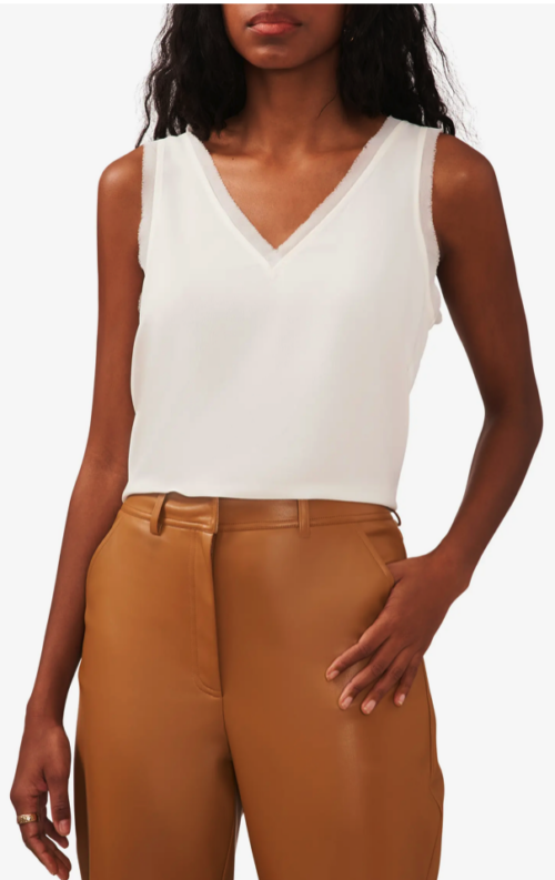 I own this raw edge silk tank from Halogen; it’s amazing. The neckline is deep enough to pair well with blazers and v-neck cardigans, but not too deep for a conservative workplace. The ivory is semi-sheer, but with a skin-toned bra isn’t showy. The raw-edge trim adds a bit of something extra.