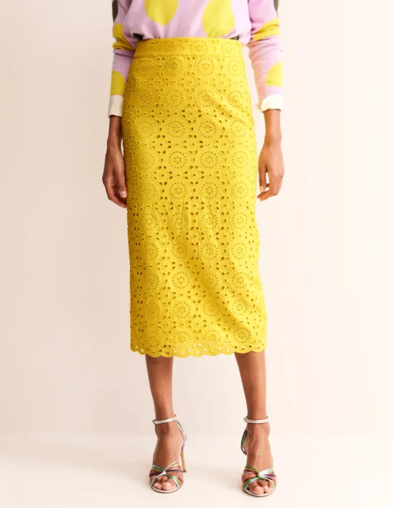 This yellow broderie skirt is perfect for summer. Just add a white blouse or a yellow striped t-shirt, and you’re good to go.