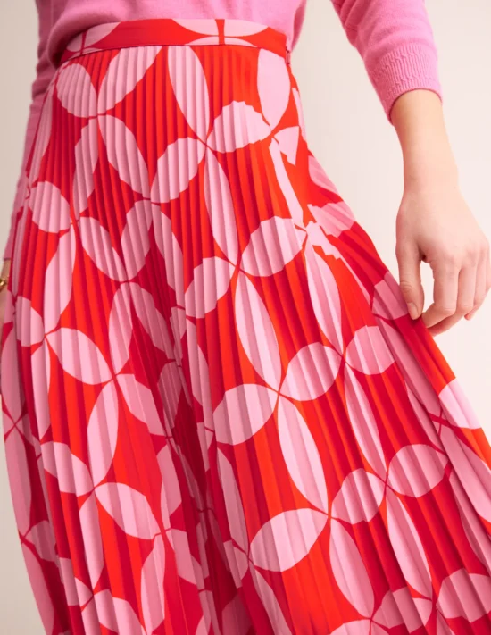 I love the color combination on this pleated skirt. Pair it with the matching top for a bold summer look. Add a red or pink sweater and boots in fall for a bright cold weather outfit.