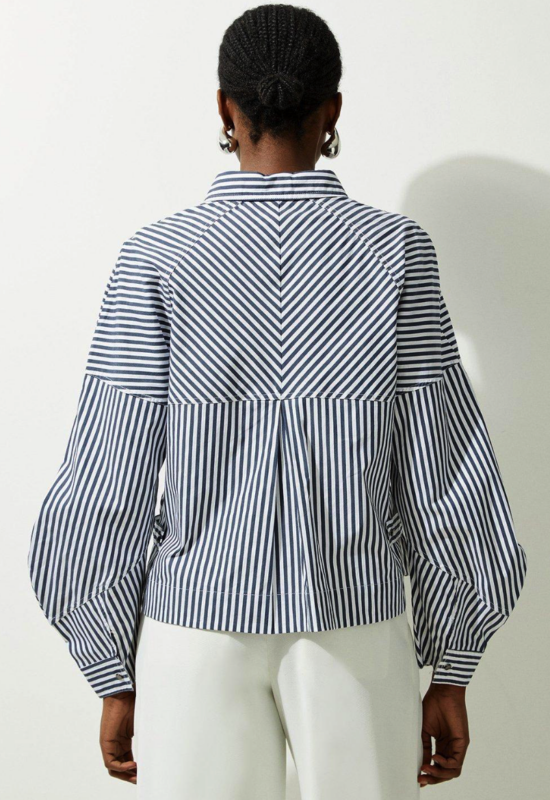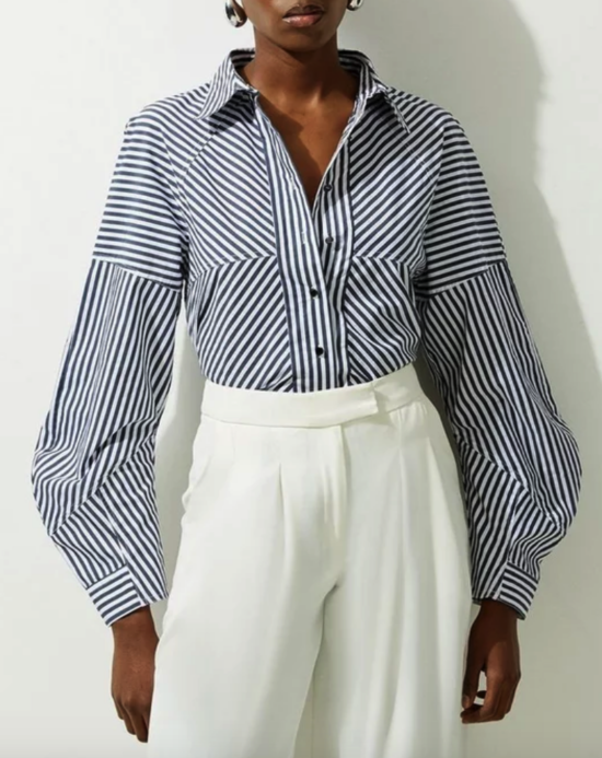 This shirt from Karen Millen has a multiple things going for it: the puffed sleeve, the varied stripe patterns, the blue buttons. Paired with a cool trouser or a slim pencil skirt, this shirt is a great piece for summer. Also, the tailoring on the back is pretty fantastic.