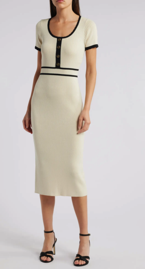 Zoe and Claire is a great brand for office-ready dresses. This short-sleeve midi sweater dress is a great piece. I love the simple styling, the classic look, and the neutral color palette. Did I mention that it’s also under-$90?