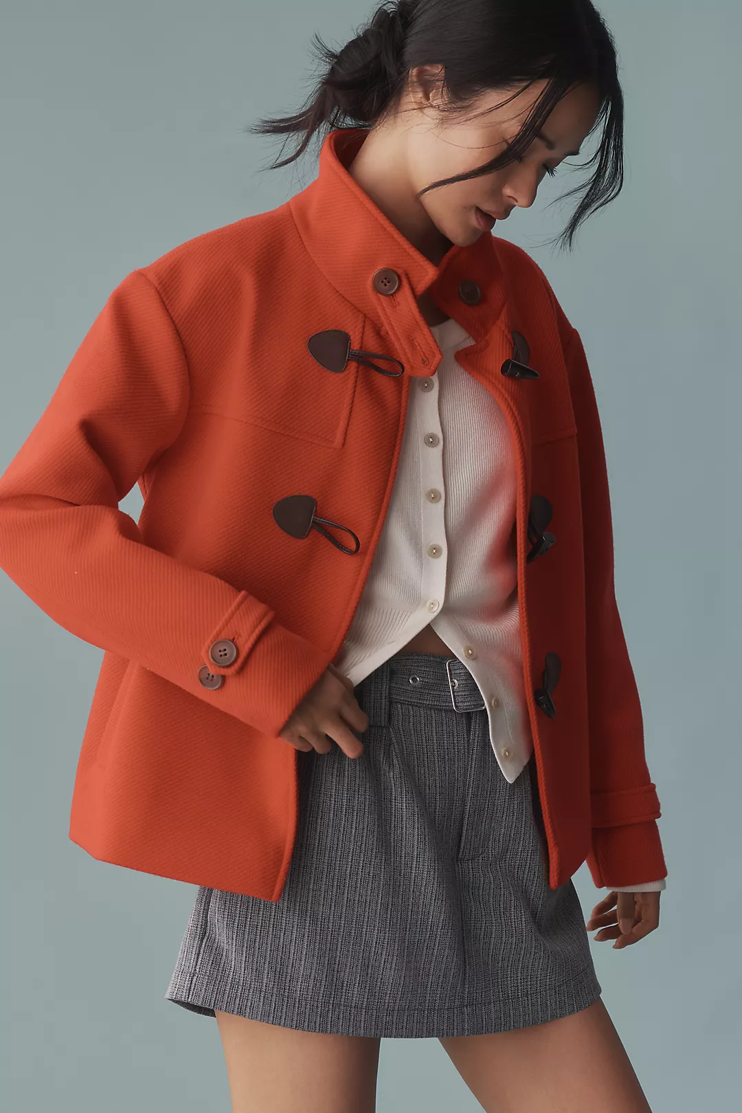 This shorter NVLT duffle coat is a great fall/winter option. I love the standup collar, the buttons, etc. And this vibrant red color is an awesome alternative if you have a closet full of neutrals.