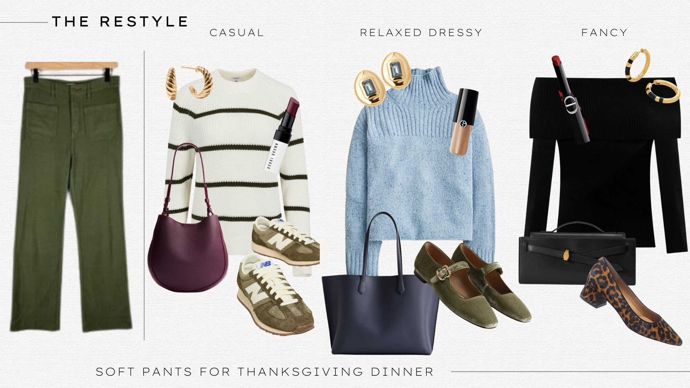We have no Thanksgiving plans. We’re not sure how it happened. But by the time we realized, it was too later to arrange anything but reservations. Living far from family and having jobs that make travel difficult, this was probably inevitable. So my attire for our relaxed dinner out will include my favorite comfortable pants. Here are some ways to style them.