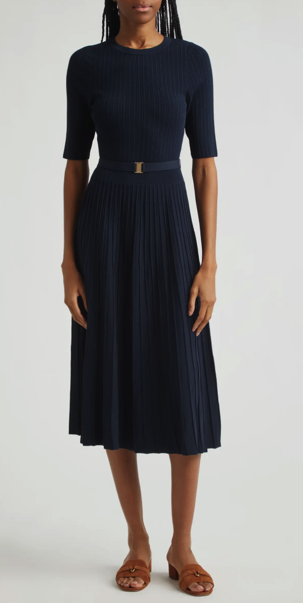 I own this dress from Veronica Beard. It is so comfortable and breezy and easy to wear. The sleeves are a good length. And the color is a rich midnight navy.