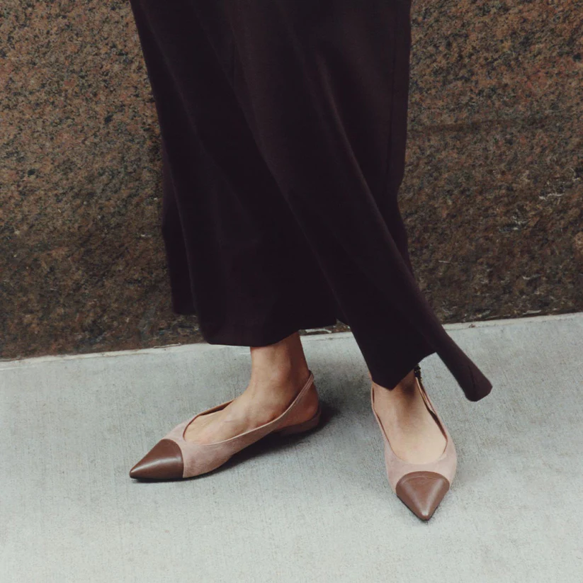 I love a cap-toe shoe. Margaux makes both a slingback and a closed heel flat in this style. While they have the basic black and tan combination, they also have some unique choices — tan and canvas, this rose combo. These are a great work shoe if you’re a person who needs maximum versatility in this price point.