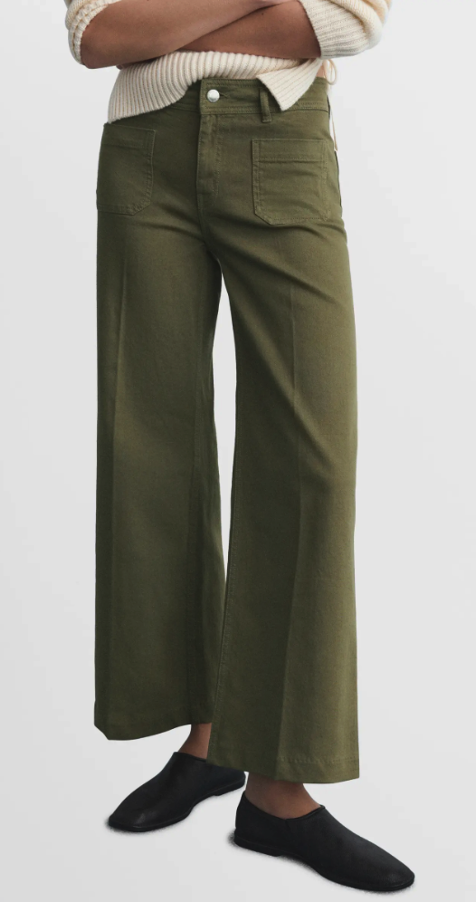 I wanted to a more interesting color palette for this outfit than denim would have supplied, so I chose these olive Mango pants. Also, I chose these pants because they were a little bit wide leg without being too oversized. A skinny pant would have made the weight of the outfit (the widest parts) live in the hips, making you a diamond shape. A straight leg or trouser leg is best, because a dramatic wide leg would just look big all over.