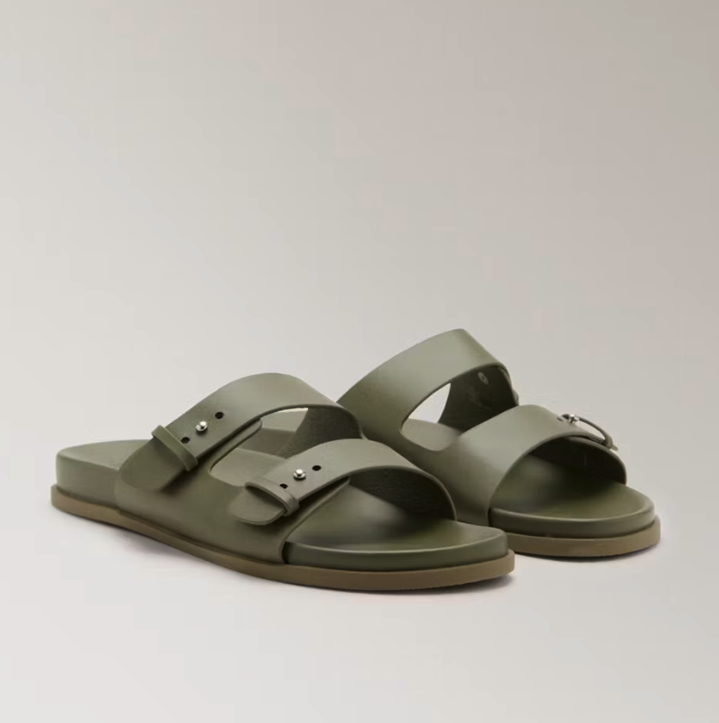My thought process here was to keep the whole leg line continuous with an olive shoe. Madewell has these olive double strap sandals right now that are selling out everywhere, and those popped into my brain, but they’re only available in size 5 or 10. So instead, I chose these very cool sandals from Mango.